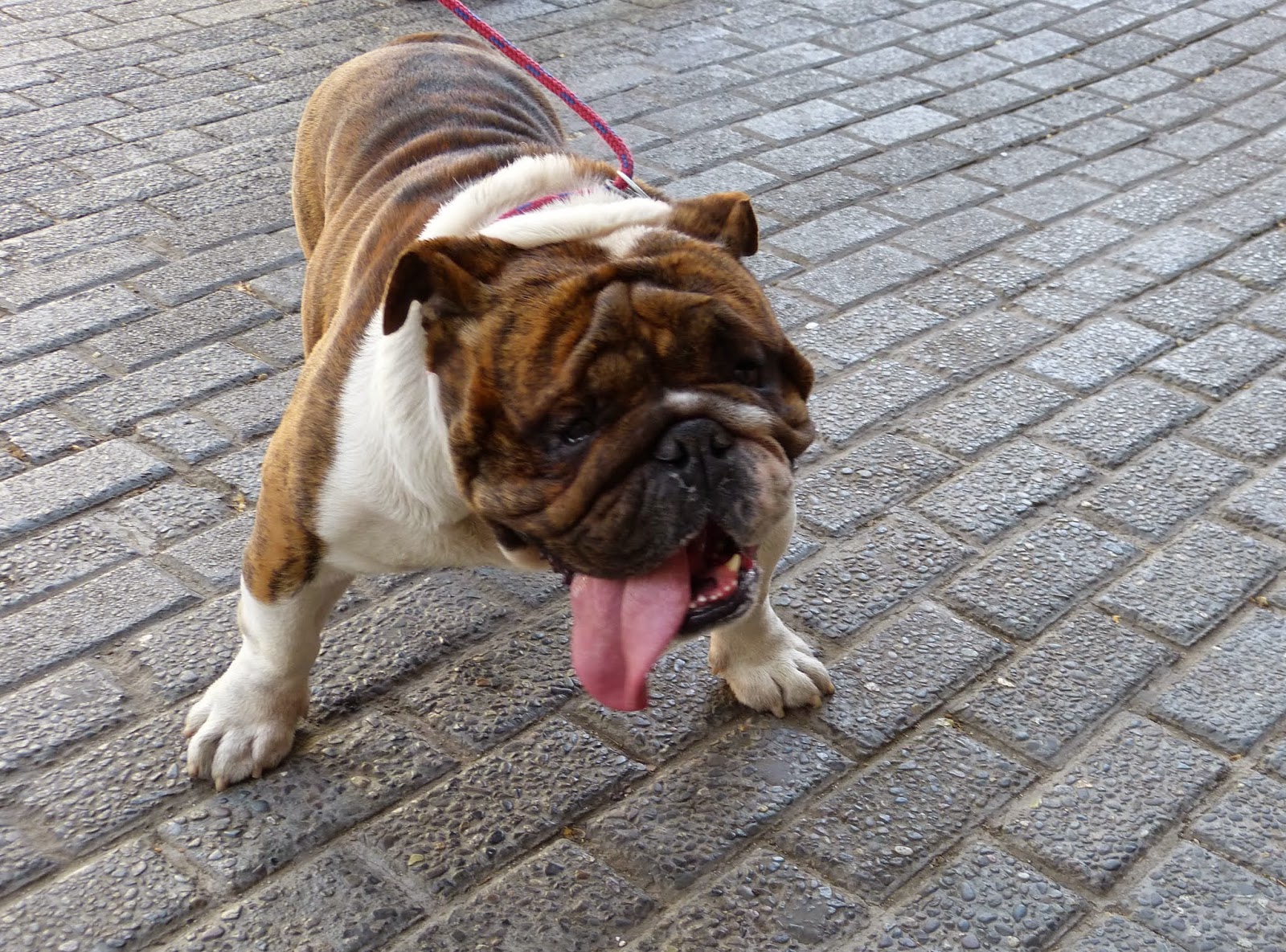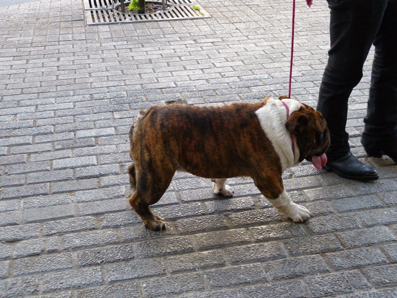 Waiting at the bus stop, who should walk by, but a favorite of mine, a handsome Bulldog. So I hollered out, "Hola, Guapo!" and his person brought him over to meet me. (There were a lot of laughs from the others at the bus stop. I suppose they didn't think this guy was that handsome.)